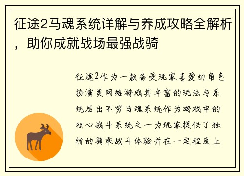 征途2马魂系统详解与养成攻略全解析,助你成就战场最强战骑